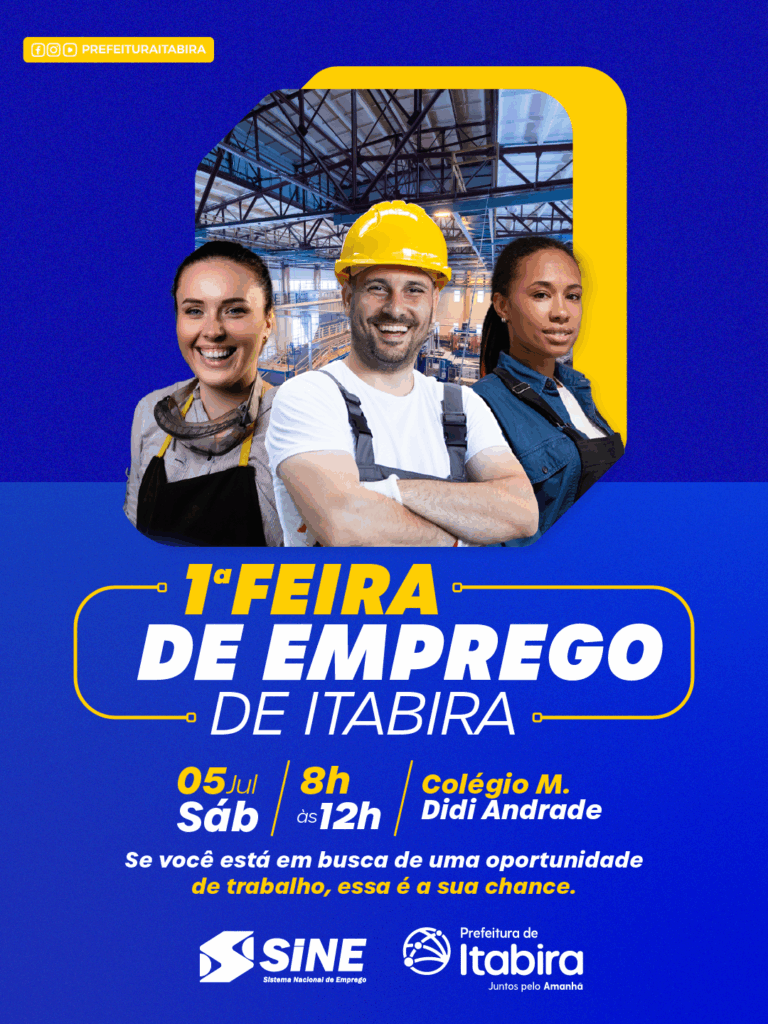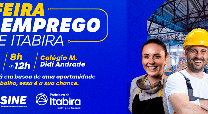 No dia 5 de julho (sábado), Itabira realiza a 1ª Feira de Emprego, com o objetivo de aproximar empresas e candidatos, além de fortalecer a economia local e oferecer uma porta de entrada para quem busca oportunidade no mercado de trabalho. O evento, gratuito e aberto ao público, será realizado no horário das 8h às 12h, no Colégio Municipal Professora Didi Andrade, na avenida Osório Sampaio.