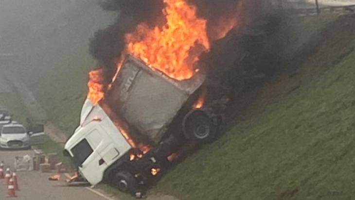 Carreta sai da pista, cai em canteiro e pega fogo na BR-381, em Barão de Cocais