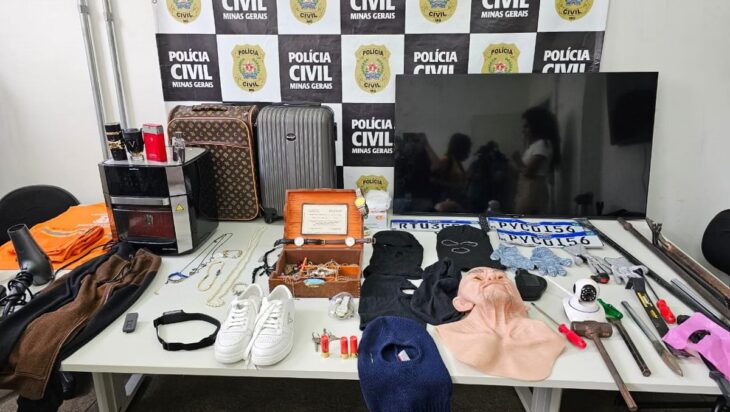 A Polícia Civil de Minas Gerais (PCMG) prendeu, no sábado (22/11), dois homens suspeitos de furtar residências de alto padrão em Belo Horizonte e na região metropolitana. A prisão ocorreu no bairro Casa Branca, na região leste da capital. Conforme apresentado pelo delegado Roberto Veran, em coletiva nesta quarta-feira (26/11), a dupla usava máscaras — inclusive com rostos humanos — para evitar ser reconhecida, além de portar um uniforme de limpeza urbana para simular ser trabalhadores caso fossem abordados pela polícia.