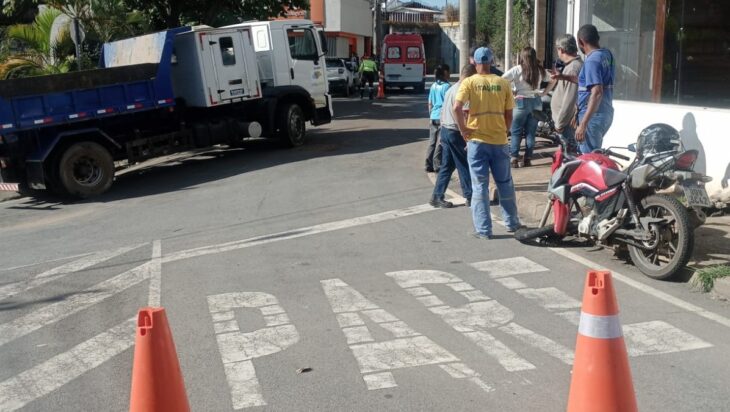 Um motociclista ficou ferido após colidir contra um caminhão da Itaurb na tarde desta quinta-feira (13), por volta das 15h30, na Rua Prefeito Virgílino Quintão, no bairro Major Lage de Baixo, em Itabira, próximo ao acesso ao Panorama.