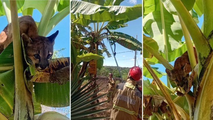 Onça-parda invade casa, sobe em bananeira e é resgatada pelos bombeiros em MG