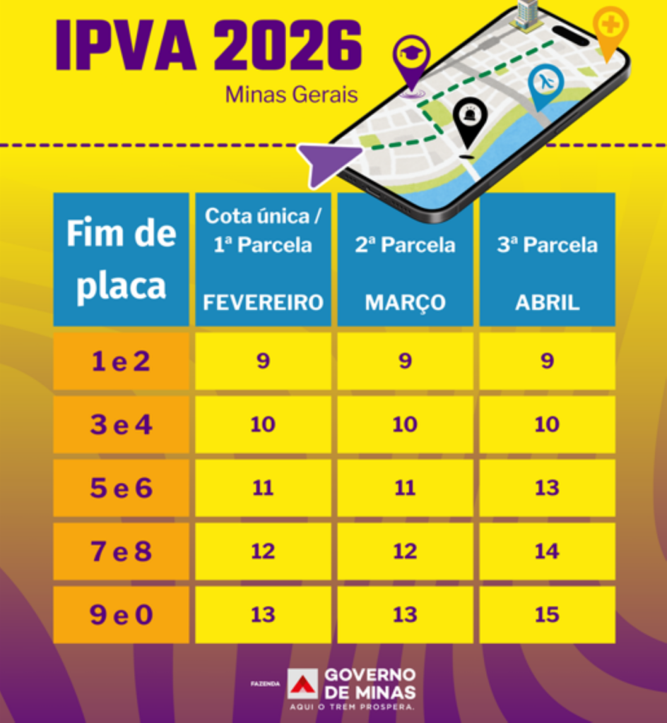Cronograma de pagamento do IPVA 2026 em Minas. (Divulgação/Governo de Minas)