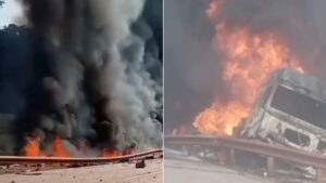 Urgente: batida entre caminhões causa incêndio, interdita a Fernão Dias e mata uma pessoa em MG